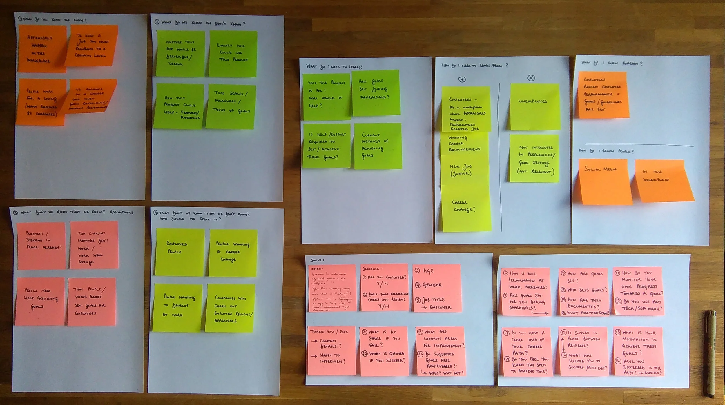 Having established the need for assistance with goal setting, tracking and achievement in the work place, I was able to follow up the widely distributed surveys with 1:1 interviews. These semi-structured conversations allowed me to find out more about personal habits, behaviours, thoughts and feelings amongst users.