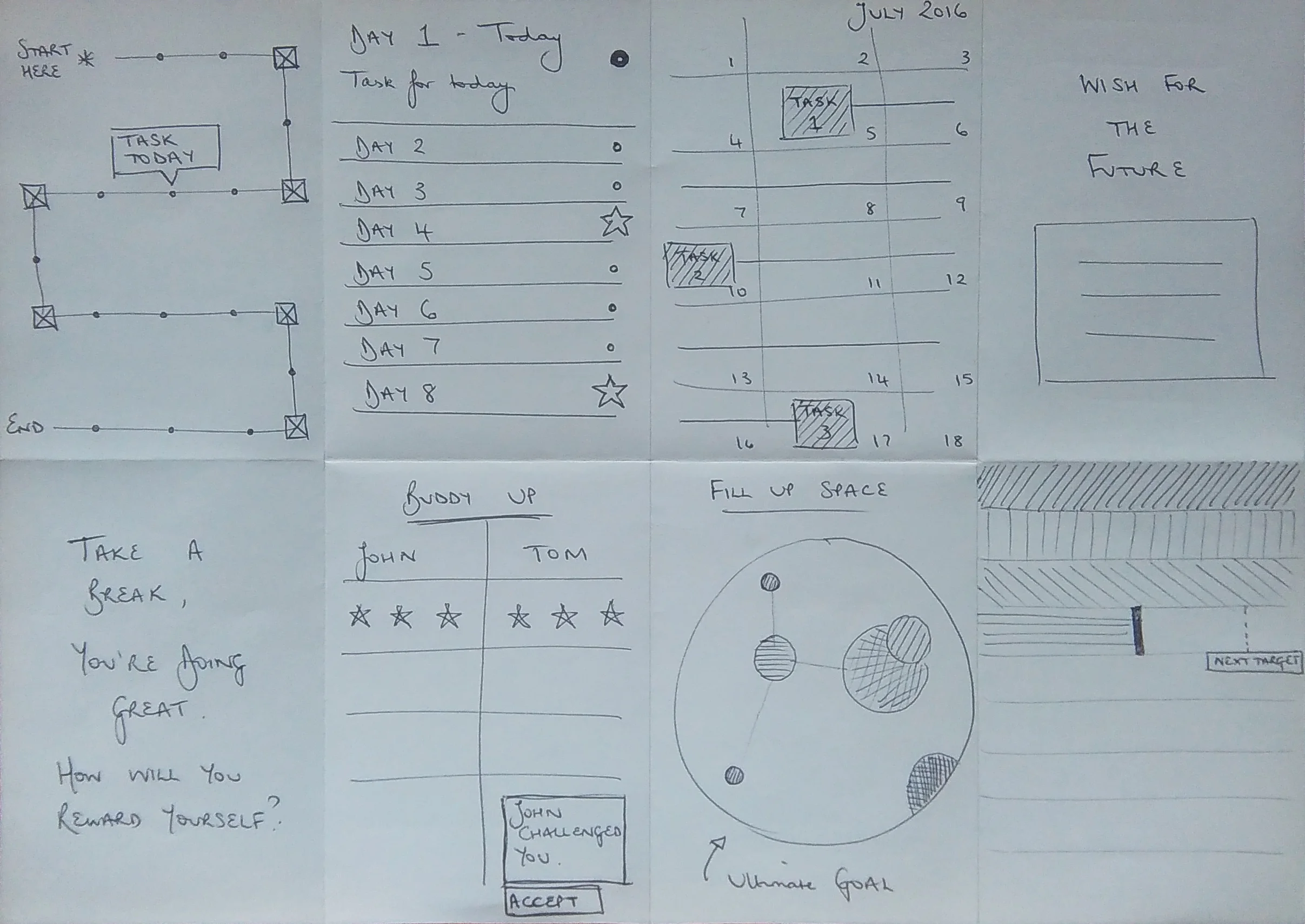 The abstract idea of using a graphic representation of filling space as the user achieves tasks/milestones/goals, is one that would then go into further design development with an interaction focus at the next stage.